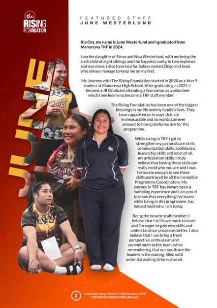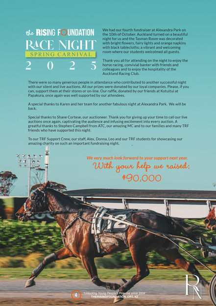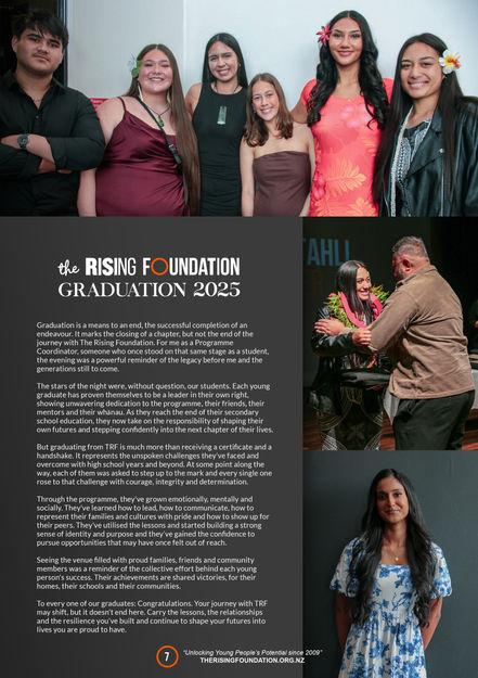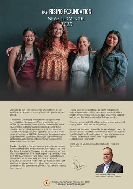 The Rising Foundation newsletters are generated on a quarterly basis, to keep everyone informed of what great work is being achieved across our programme. Topics covered include camps, excursions, fundraising events and Transition 2 articles. We appreciate the time you spend in reading our Newsletters which we hope will enlighten you what our programme is accomplishing in South Auckland.